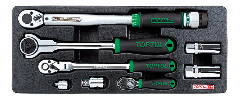 Набор трещоток 1/4", 3/8", 1/2", динамометрический ключ 3/8" 20-110 Нм, переходники и свечные головки, 8 предметов в ложементе (B) TOPTUL купить в Севастополе и других городах России