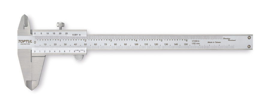 Штангенциркуль 150 мм 0,02 мм (IACA0150) предназначен для измерения наружных и внутренних размеров заготовки, глубины.
