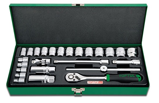 Набор головок и аксессуаров 3/8" 12-гранных 6-24 мм, 25 предметов в метал. кейсе TOPTUL