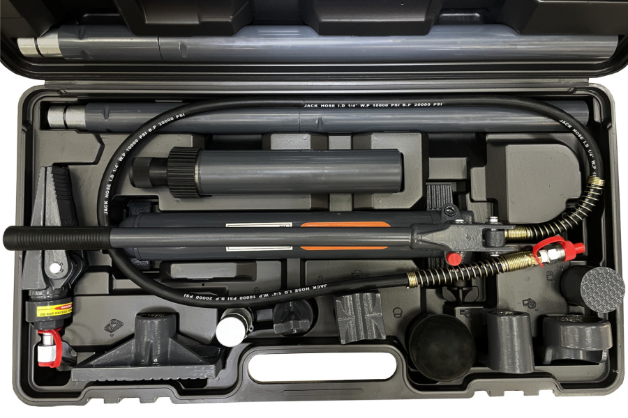 Комплект поставки: насос с усилием 10 т, цилиндр с ходом штока 130 мм, 4 удлинительные трубки, распорка, пята плунжера, клиновидная головка, V-образное основание, соединитель тип «папа», седло рифленое, резиновая головка, плоское основание, гидравлический шланг, рассчитанный на тяжелые режимы работы, кейс.